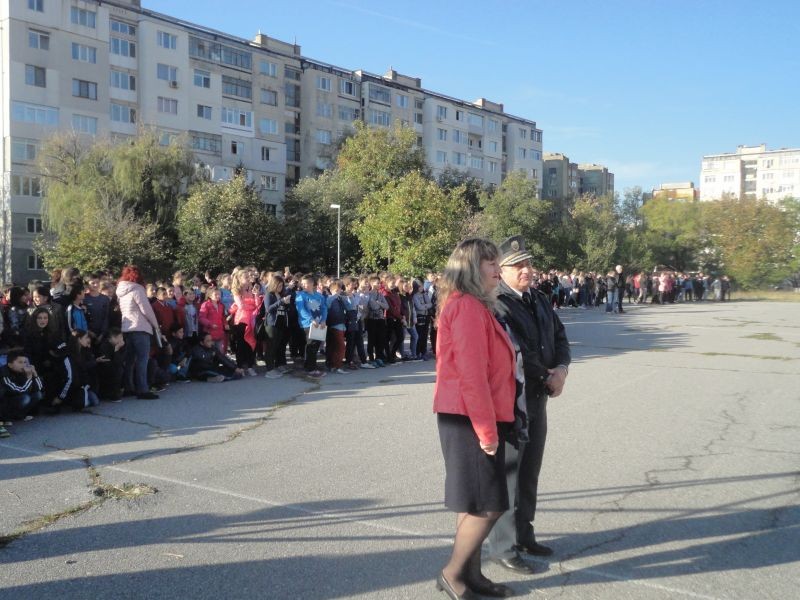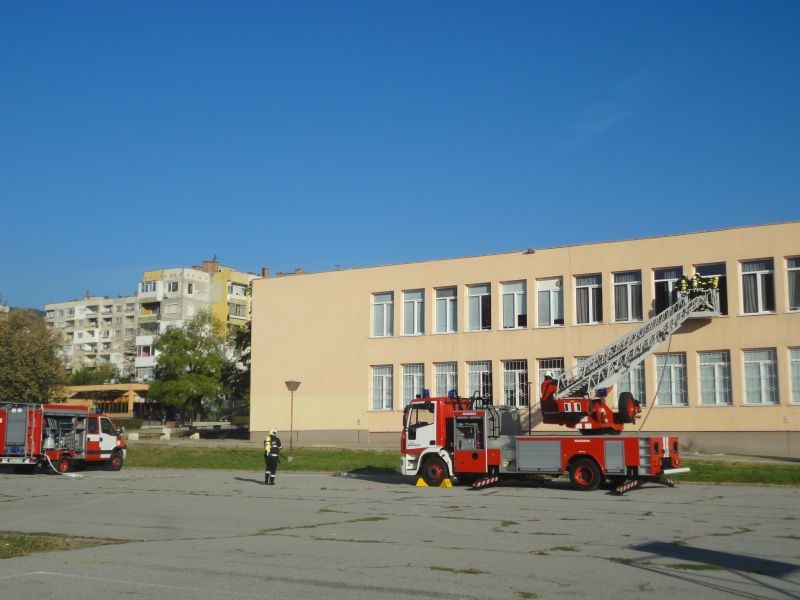 Проявата беше организирана от Районна служба „Пожарна безопасност и защита на населението” съвместно с учебното заведение. Съгласно заданието, пожарът възникна в учебен кабинет на втория етаж. Сигналът от пожароизвестителната инсталация, с която е оборудвано училището, беше подаден в 9,20 часа. Действията на учителите бяха много добре синхронизирани и учениците бяха изведени веднага от сградата. На петата минута вече бяха строени на спортната площадка, южно от училищната сграда, а класните ръководители извършиха поименна проверка и докладваха на директора г-жа Величка Христова за отсъстващи ученици. „Това е добър резултат. Нямаше паника и излишно блъскане при придвижването на учениците”, заяви Тошко Колев, началник група „Пожарогасителна и спасителна дейност” в Районна служба „Пожарна безопасност и защита на населението”. Според него това се дължи на добрата подготовка на учениците, както и на професионалните действия на персонала, който е задължен да отвори изходите и да насочва човешките потоци. „Учениците напуснаха училището през различни входове, а не само през един”, отбеляза Колев. В двора на училището учениците наблюдаваха демонстрация на гасителни дейности и спасителна акция на учител, който беше блокиран в задимена стая на втория етаж. По-късно те се запознаха с противопожарното оборудване на автомобилите. Акцията беше проведена успешно, благодарение на опита на служителите, което се постига с постоянна работа и занятия. „Екипът беше с численост от девет души, с три пожарни автомобила – единият беше автомеханична стълба, а другите два автомобили – за пожарогасителни действия”, каза Тошко Колев.