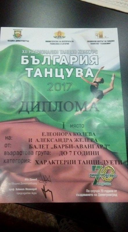 В раздел "Класически балет" първо място спечелиха Преслава Йорданова Симеонова от 2 „а” клас при ОУ „Елисавета Багряна” и Александра Йорданова, с ръководител г-жа Силвия Терзиева. Елеонора Колева от 1 "а" клас също се класира на първо място.Във фестивала участваха Национални балетни училища от София, Варна, Бургас, балетна школа „Звездна дъга”, „Феерия”, „Тангра”, „Галаксико” и много други от цялата страна.
