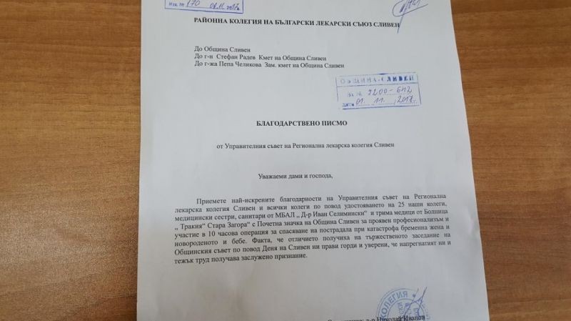 В Община Сливен е получено благодарствено писмо от Управителния съвет на Регионалната лекарска колегия до кмета Стефан Радев и зам.-кмета по „Хуманитарни дейности“ ПепаЧиликова.