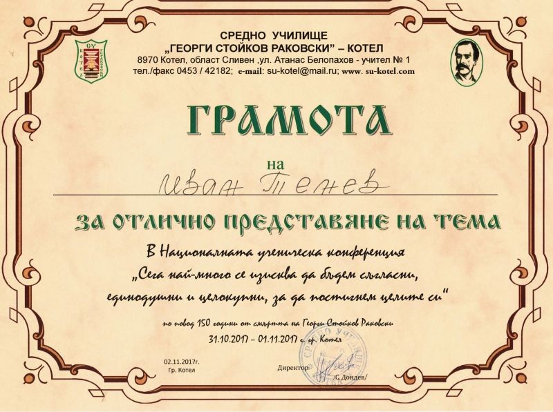 „Отношението на Георги С. Раковски към църковно-националната борба и приносът му в нея според историографските му произведения, лична кореспонденция и публицистика”, е темата на презентацията, с която дванайсетокласникът от Профилираната хуманитарна гимназия „Дамян Дамянов” Иван Тенев предизвика интереса на журито от трима професори-историци на проведената в Котел национална ученическа конференция. Той получи Грамота за отлично представяне и подарък – книгата на Панко Анчев „Българският ум, непрочетеният Г.С. Раковски”. Добре се представиха и останалите трима участници-единайсетокласници. Петя Андреева прочете своето есе „Георги Раковски за политиката на Русия спрямо българите”, а нейната съученичка Денислава Стойчева – есето си „Георги Раковски – идеолог на Българското Възраждане”. „Публицистът Раковски – непознатата страна на революционера”, бе темата на есето на Габриела Калчева.