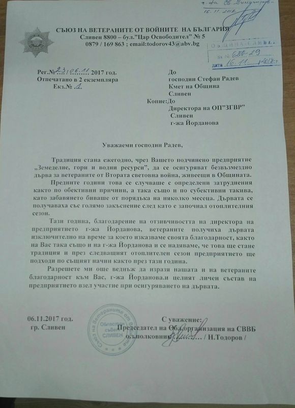 Областната организация на „Съюза на ветераните от войните в България“ в Сливен изпрати благодарствено писмо за получените от ветераните навреме дърва за огрев. Писмото е адресирано до кмета на Сливен Стефан Радев и директора на Общинското предприятие „Земеделие, гори и водни ресурси“- Даниела Йорданова.