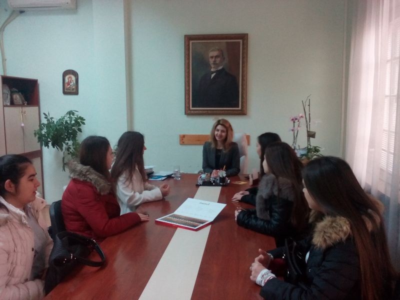 Заместник- кметът по хуманитарни дейности Пепа Чиликова се срещна днес в кабинета си с ученици от 12 „е “ клас на ППМГ „ Добри Чинтулов“ - Сливен. Тя разказа подробности за ресора, в който работи и обясни, че в него са включени образование, социални дейности, култура, вероизповедания, спорт. Повод за срещата беше учениците да се запознаят с работата на институцията.