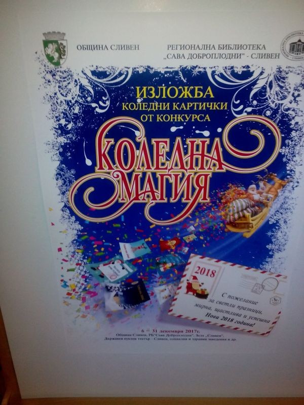 Кътове от сградите на Община Сливен, Регионална библиотека „Сава Доброплодни“, зала „Сливен“, Държавен куклен театър-Сливен, социални и здравни заведения стават изложбени зали за коледни картички. Те са изработени от деца в рамките на традиционния конкурс „Коледна магия“, организиран от РБ „Сава Доброплодни“. Изложбата се открива на 6 декември и ще продължи до 31 декември. „Картичките ще бъдат насочени към хора в неравностойно положение, с които да ги поздравим за празниците“, заяви заместник-кметът Пепа Чиликова. От нея стана ясно, че част от картичките ще бъдат предлагани с благотворителна цел. Средствата, събрани от тях ще се добавят към сумата за спасяване на паметника на Шести артилерийски полк.