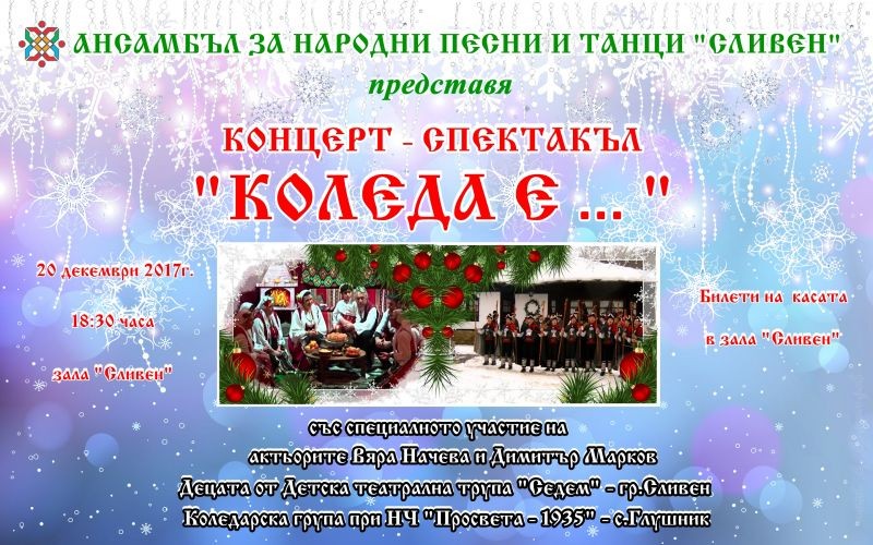 Ансамбълът за народни песни и танци- Сливен ще представи пред сливенска публика концерт-спектакъла „Коледа е…“. Спектакълът ще бъде със специалното участие на актьорите Вяра Начева и Димитър Марков, на Детска театрална трупа „Седем“ и на Коледарска група при НЧ „Просвета-1935“ – село Глушник. Концертът-спектакъл ще бъде на 20 декември 2017 г., от 18.30 часа в зала „Сливен“. Билети – на касата в залата.
