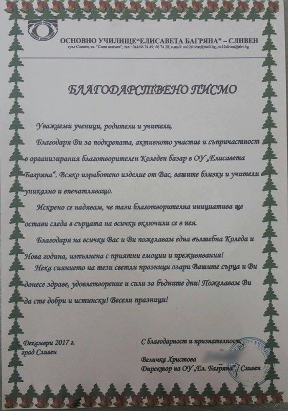 Директорът на ОУ "Елисавета Багряна" г-жа Величка Христова благодари на всички ученици, родители и учители, които се включиха в благотворителния коледен базар в понеделник, 18 декември.