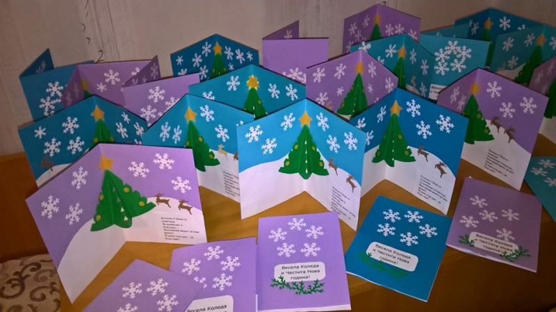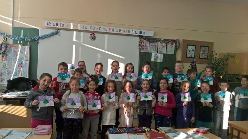 След като учениците от 1 „а” клас се включиха в благотворителната кампания на БЧК „Деца помагат на деца” и изработиха коледни картички, с които да зарадват възрастните хора в старчески домове, дойде ред и за най-обичаните хора. В часовете на групата по интереси „Децата и изкуството” учениците изработиха за своите семейства коледни картички с пожелание: