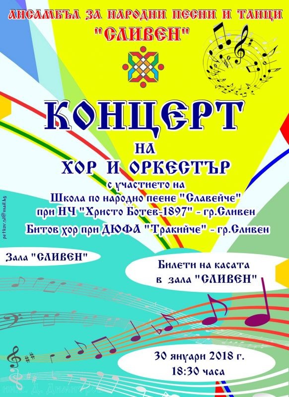 На 30 януари 2018 г. от 18,30 часа в зала „Сливен” ще се състои вокално-инструментален концерт на хора и оркестъра към Ансамбъла за народни песни и танци – Сливен. Подобен съвместен концерт не е провеждан от много години. В него ще вземат участие и младите изпълнители от Школата за народно пеене "Славейче" при НЧ "Христо Ботев - 1897" – Сливен, и Битов хор при ДЮФА "Тракийче" при ЦПЛР - Детски комплекс, Сливен. Концертът ще е своеобразна среща на професионализма с младостта. Идеята е младите изпълнители да се докоснат до артистите, които са се заели с тежката задача да поддържат пламъка на фолклорното ни богатство и да не позволяват той да изгасне. В програмата са включени изпълнения на известни автори в областта на музикалното и песенно фолклорно изкуство.