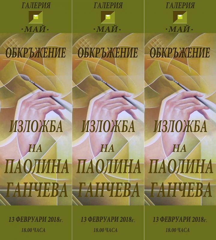 На 13 февруари от 18 ч. в сливенската галерия „Май” ще бъде открита самостоятелната изложба „Обкръжение” на Паолина Ганчева. Ще бъдт показани живописни платна, които представят средата, която заобикаля художничката, пречупена през нейната творческа индивидуалност и поглед.