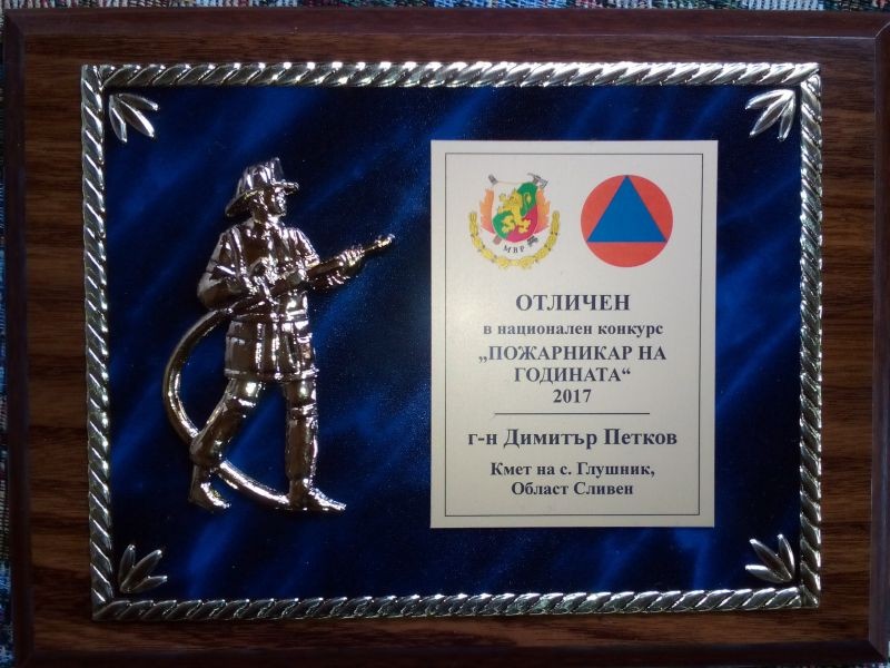 Кметът на с. Глушник Димитър Петков беше удостоен с грамота от националния конкурс „Пожарникар на годината 2017“, съобщи инж. Снежана Кънева, началник- отдел „Сигурност и управление при кризи“. Това стана на тържествена церемония в Централния вонен клуб - София, където се връчиха наградите от конкурса. Грамотата беше връчена в категорията за съществен и конкретен принос на кмета на сливенското село за осигуряване на пожарната безопасност и защита на населението. Заслугите на кмета са за овладяване на горския пожар в местността „Черковното“ през лятото на 2017 г. и особено за активната му дейност при включването на доброволците и оперативното ръководство на доброволното формирование „Грамадите” за овладяване на извънредни ситуации в резултат на природни стихии и пожари. Призът беше връчен лично от заместник-министъра на вътрешните работи Милко Бернер.