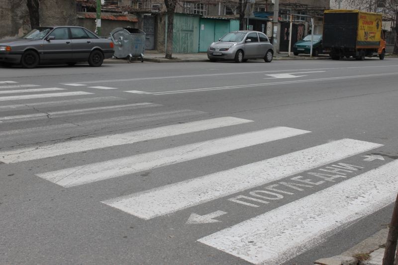 На снимката: Пешеходна пътека на бул."Панайот Хитов" - пътеката е с надпис "Погледни", поставени са и предупредителни знаци от двете й страни.