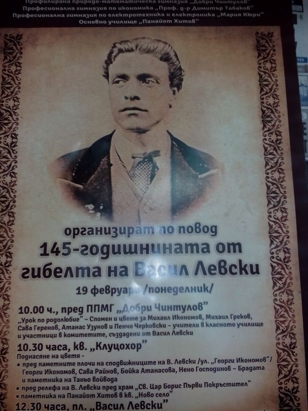 145 години от гибелта на Васил Левски ще бъдат отбелязани на 19 февруари. От 10 ч. пред сградата на ППМГ „Добри Чинтулов” ще се проведе „Урок по родолюбие” на тема „Спомен и цвете за Михаил Икономов, Михаил Греков, Сава Геренов, Атанас Узунов и Пенчо Черковски – учители в класното училище и участници в комитетите, създадени от Васил Левски“. Учениците от гимназията и представители на сдружение „Мати Болгария“ ще поставят цветя и пред паметните плочи на сподвижниците на Васил Левски - Георги Икономов, Сава Райнов, Бойка Атанасова, Нено Господинов – Брадата и пред паметника на Таньо войвода.