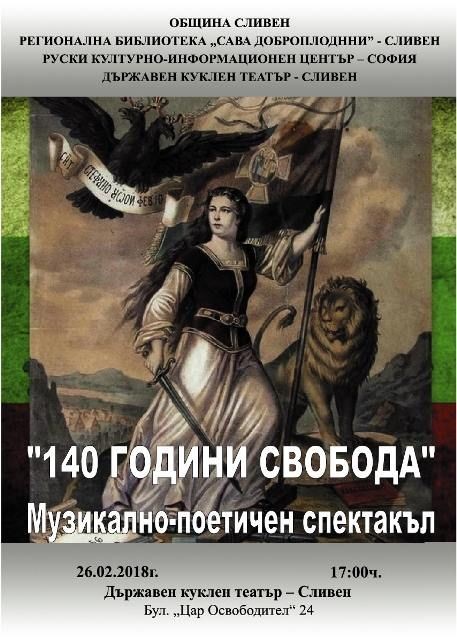 На 26 февруари 2018г., в навечерието на 140 – годишнината от сключването на Санстефанския мирен договор и обявяването на свободата на България Регионална библиотека „Сава Доброплодни” – Сливен с подкрепата на община Сливен, Руския културно-информационен център – София, Съюза на рускоезичните писатели в България и Държавен куклен театър–Сливен организират музикално-поетичен спектакъл „140 години свобода”. Спектакълът ще се проведе от 17:00ч. в залата на Държавен куклен театър–Сливен.
