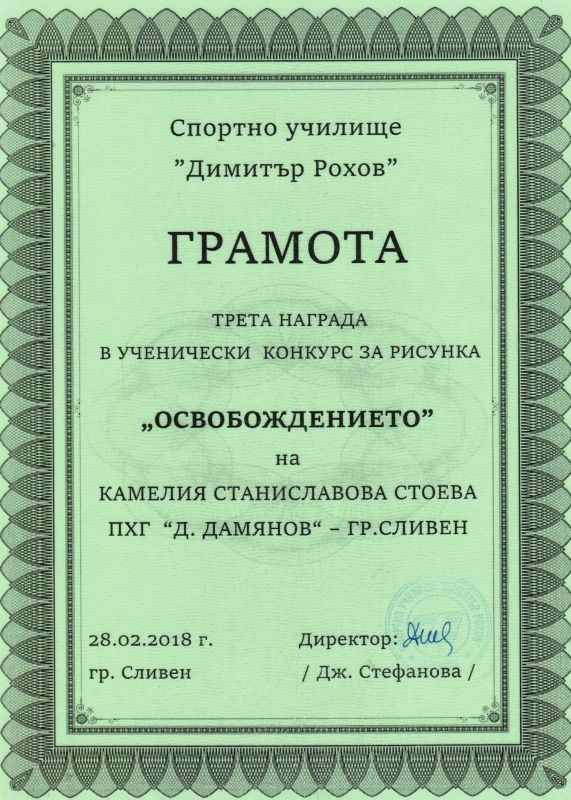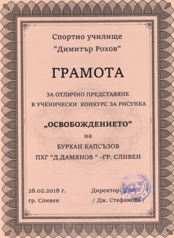 В сряда в Спортно училище „Димитър Рохов“ в Сливен бе открита изложба от конкурсни ученически творби по повод 140-та годишнина от Освобождението на България. В художествената надпревара на тема „Освобождението“ участват 108 рисунки на ученици от 12 училища. Директорът на училището Дженка Стефанова връчи първа, втора и трета награда в съответните възрастови групи на ученичките от Профилираната хуманитарна гимназия „Дамян Дамянов“ - Сияна Атанасова, Ивелина Иванова и Камелия Стоева. Специална награда получи и учителят им по изобразително изкуство Бурхан Капсъзов. Творбите на нашите млади художнички са вдъхновени от реални събития и личности от един от най-светлите периоди в българската история. Рисунките могат да се видят на подредената изложба във фоайето на Спортното училище.