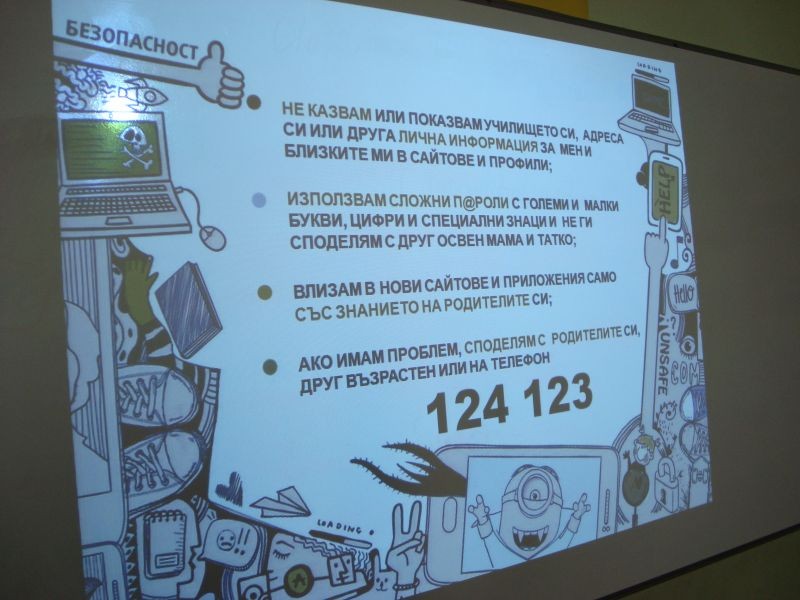 Децата се запознаха както с основните опасности в мрежата, като вируси и зловреден софтуер, контакти с непознати, онлайн тормоз между връстници и фалшиви новини, така и с начините за реакция и превенция. Бяха обсъдени начините за докладване и блокиране, подаване на сигнал на сайта на Центъра за безопасен интернет на номер 123 и 124, осигуряване на екранни снимки като доказателство, създаване на силни пароли, управление на настройки за поверителност в социални мрежи и разпознаване на достоверна информация в интернет.