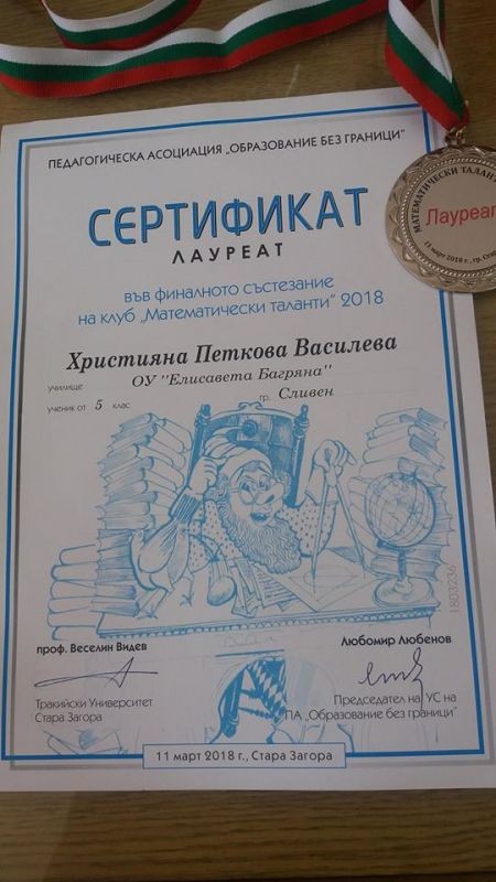 Ученичката Християна Василева от 5. клас от ОУ "Елисавета Багряна" е лауреат в състезание по математика, което се проведе в неделя в Стара Загора. В състезанието взеха участие ученици от 1. до 6. клас, класирали се на финал след проведени шест квалификационни кръга. То беше организирано от педагогическа асоциация „Образование без граници“.