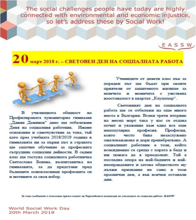 ГИМНАЗИЯ „ДАМЯН ДАМЯНОВ“ ОТБЕЛЯЗА СВЕТОВНИЯ ДЕН НА СОЦИАЛНАТА РАБОТА