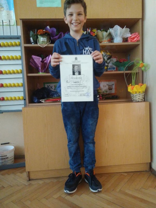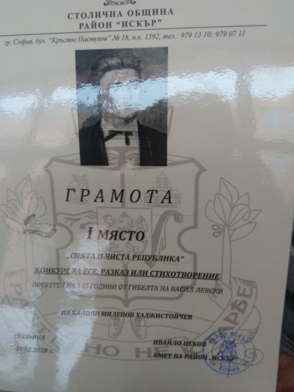 С голяма гордост споделяме, че нашият талантлив Калоян Милков Хаджистойчев, ученик от III "Б" клас в нашето училище, спечели I място и в конкурса за есе, разказ или стихотворение „Свята и чиста република“ на столична община Район „Искър“, посветен на 145 годишнината от гибелта на Васил Левски. Наградата е подписана от кмета на Район „Искър“ гр. София Ивайло Цеков и дойде в навечерието на националния празник – Трети март.