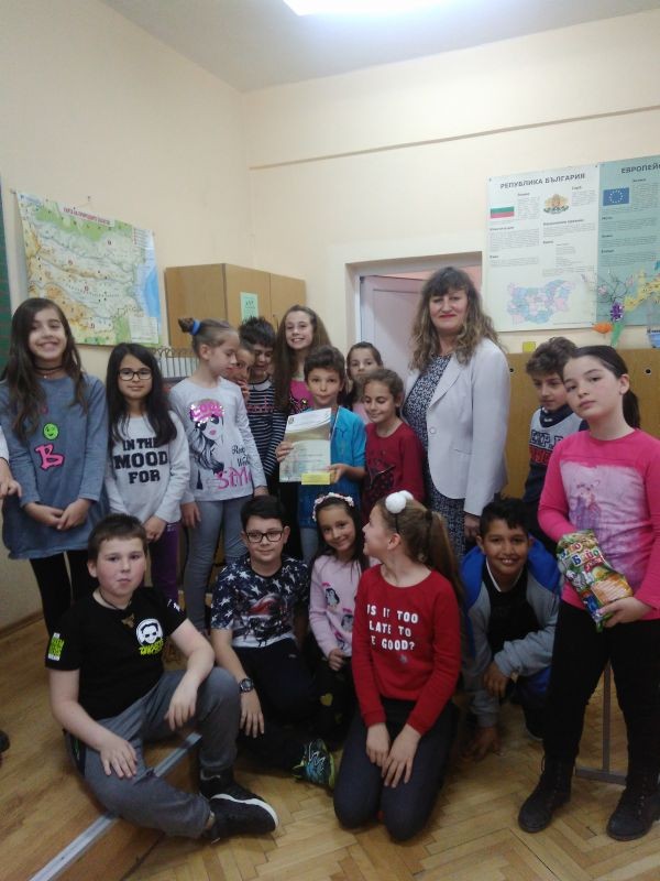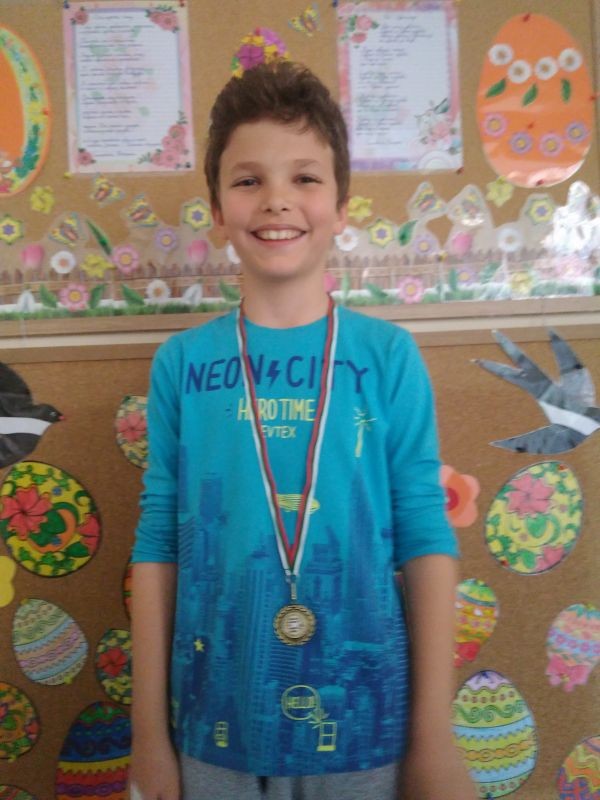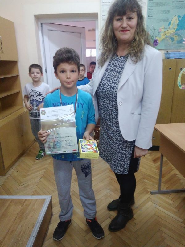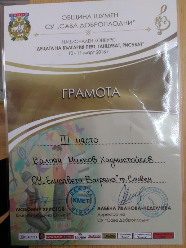 Поредната грамота за нашето талантливо момче Калоян Милков Хаджистойчев, ученик от III „б” клас в нашето училище. Този път Калоян печели бронзов медал, грамота и подаръци от Национален конкурс „Децата на България пеят, танцуват, рисуват“ 10 -11 Март 2018г. на община Шумен, СУ „Сава Доброплодни“. Наградата се присъжда от кмета на града Любомир Христов.