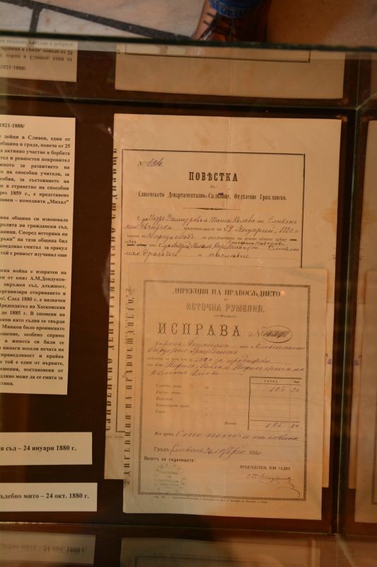 В изложбените витрини бяха подредени снимки на някои от първите съдии в Сливен след Освобождението, които до тогава са били учители, бивши опълченци, търговци или мъже, завършили правни науки в Европа. Председател на Сливенския окръжен съд през 1878 г. е бил Андонаки Икономов, който преди това е работел като учител.А завършилият право във Франция Ненчо Кръстев е оглавявал Областния съд. Сред интересните факти е, че Христо П. Славейков, син на Петко Р. Славейков, след 1892 г. също е бил съдия в Окръжния съд. На експозицията бяха показани призовка или "повестка" от 24 януари 1880 година, формуляр за съдебна делба, отличителния знак-медальон на мирови съдия от същата година и др.