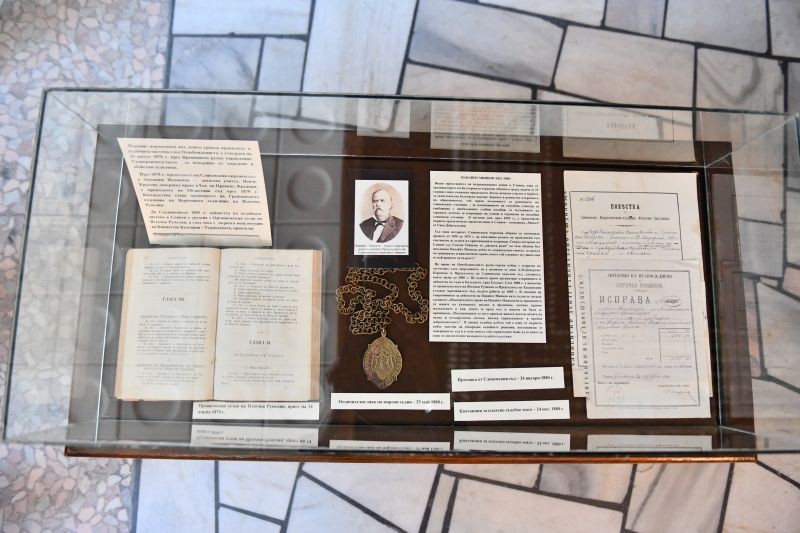 Изложба „Под егидата на Темида“ беше открита днес във фоайето на втори етаж на Съдебната палата. Тя се осъществява съвместно от Регионалния исторически музей и Окръжния съд. Експонатите са свързани с началото на правораздаването в град Сливен до Втората световна война. Представени са първите магистрати и съдебни актове от този период. Сред експонатите е и Отличителен знак на мирови съдия от Източна Румелия от 1880 г.