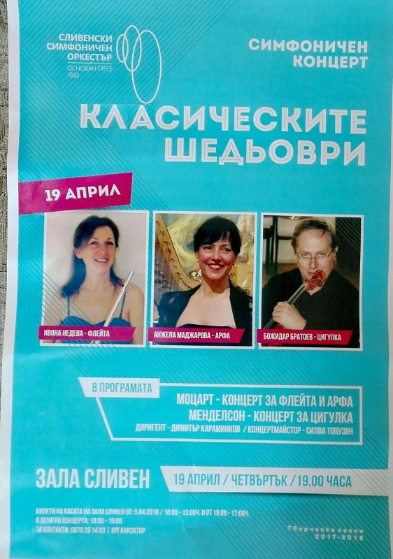 Солисти ще бъдат Ивона Недева – флейта, Анжела Маджарова – арфа и цигуларят Божидар Братоев, а концертмайстор - Силва Топузян.