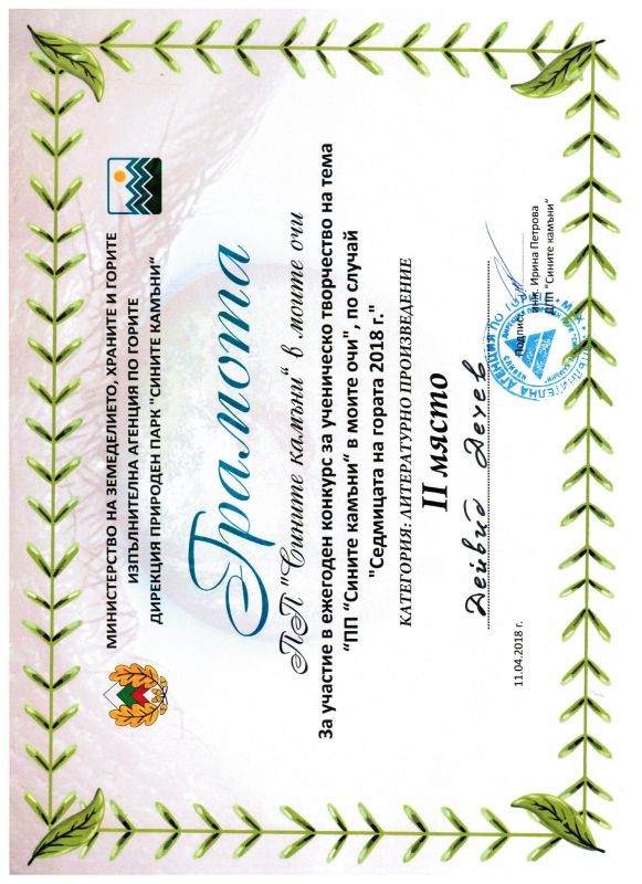 Независимо от „фаталния“ петък 13-и, ученици от сливенската Хуманитарна гимназия „Дамян Дамянов“ бяха наградени в конкурс, организиран от Министерство на земеделието, храните и горите; Изпълнителна агенция по горите и ДПП „Сините камъни“, посветен на Седмицата на гората. Станиела Рускова (от IXa клас) беше удостоена с първото място в категория „Авторска снимка и презентация“, а Дейвид Дечев (от VIIIa клас) беше класиран на второ място в категория „Литературно произведение“. Служителите на дирекцията заявиха, че в конкурса участие са взели много деца и младежи от всички възрасти и избора на най-добрите e бил изключително труден. Пожелаваме на възпитаниците на Профилирана хуманитарна гимназия „Дамян Дамянов“ много нови творчески успехи!