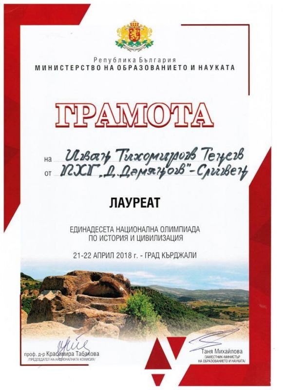 Дванадесетокласникът от Профилираната хуманитарна гимназия “Дамян Дамянов“ в Сливен Иван Тенев е лауреат на Националната олимпиада по история, провела се в гр. Кърджали от 20 до 22 април 2018 г. Той е сред тримата дванадесетокласници, заслужили оценка отличен 6.00 в Националния кръг на най-важното за годината състезание за млади историци. (Другите две оценки пълен отличен са за ученици от Карлово и Бургас.) Лауреатското звание осигурява на зрелостника хуманитарист право на прием без участие в конкурси в най-търсените специалности на най-престижните български университети.