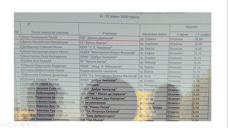 Дванадесетокласникът от Профилираната хуманитарна гимназия “Дамян Дамянов“ в Сливен Иван Тенев е лауреат на Националната олимпиада по история, провела се в гр. Кърджали от 20 до 22 април 2018 г. Той е сред тримата дванадесетокласници, заслужили оценка отличен 6.00 в Националния кръг на най-важното за годината състезание за млади историци. (Другите две оценки пълен отличен са за ученици от Карлово и Бургас.) Лауреатското звание осигурява на зрелостника хуманитарист право на прием без участие в конкурси в най-търсените специалности на най-престижните български университети.
