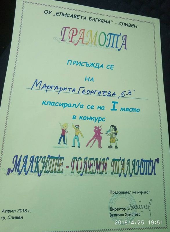 На първо място бяха отличени Анна Василева - 2 клас и Дария Караджова - 3 клас; Никол Тенева и Ивайла Андонова - 2 клас; Маргарита Георгиева - 6 клас; Силвена Пенчева -7 клас и Памела Димитрова - 7 клас.