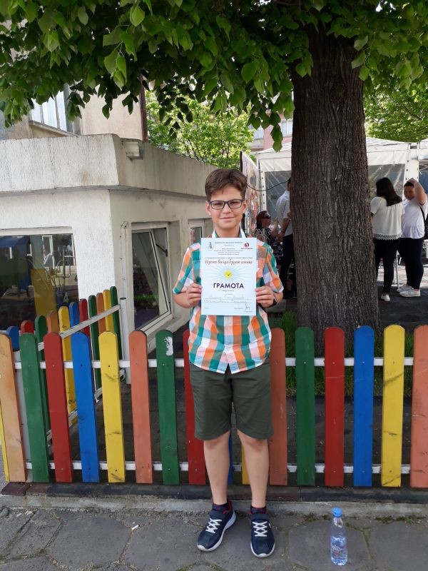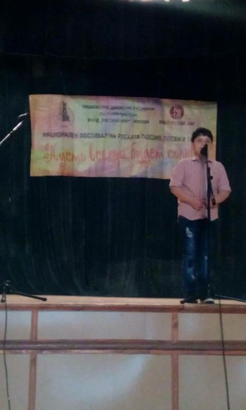 На 24.04.2018г. се проведе областният етап на V-я национален фестивал на руската поезия, песен и танц ,,Пусть всегда будет солнце”. Нашето училище участва за трета поредна година. В жанр поезия се включиха Красена Каменова от II „в” клас, Виктор Кръстев, Мартин Минев и Стоян Стефанов от V „а” клас. С песента ,,Позови меня тихо по имени ” се представи Алекс Колев от V „б” клас. Рая Данева и Габриела Енчева от II „в” изпълниха танц ,,Чайки над вълни”. Участие взе и мажоретният състав при училището, като се класира на второ място. Второ място зае и Алекс Колев, който направи запомнящо се изпълнение. В първа възрастова група за поезия нашият представител Красена Каменова се класира на първо място. Първо място зае и Стоян Стефанов във втора възрастова група. Рая и Габриела също заеха престижното първо място. Всички наши участници се представиха достойно и развълнуваха журито и публиката.