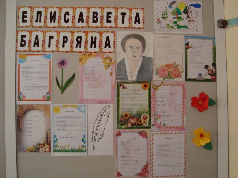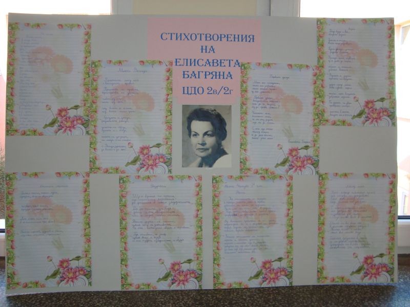 По случай празника на ОУ "Елисавета Багряна" учениците от ЦДО от II "в”,” г" класове показаха своята признателност към патрона на училището, изписвайки красиви стихотворения на Багряна. Те са изложени и красят един от коридорите на училището. По-малките ученици имат възможност да видят и прочетат някои от известните творби на голямата поетеса.