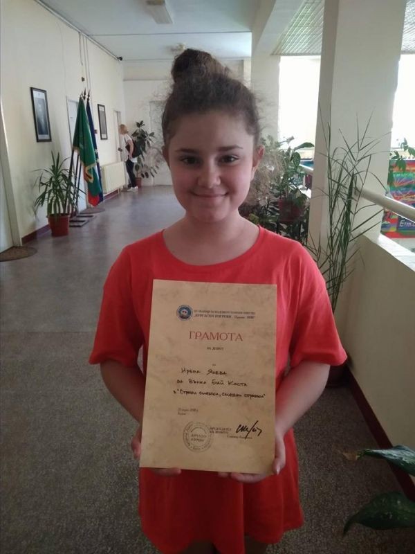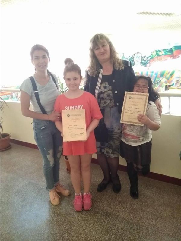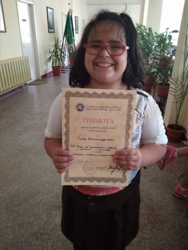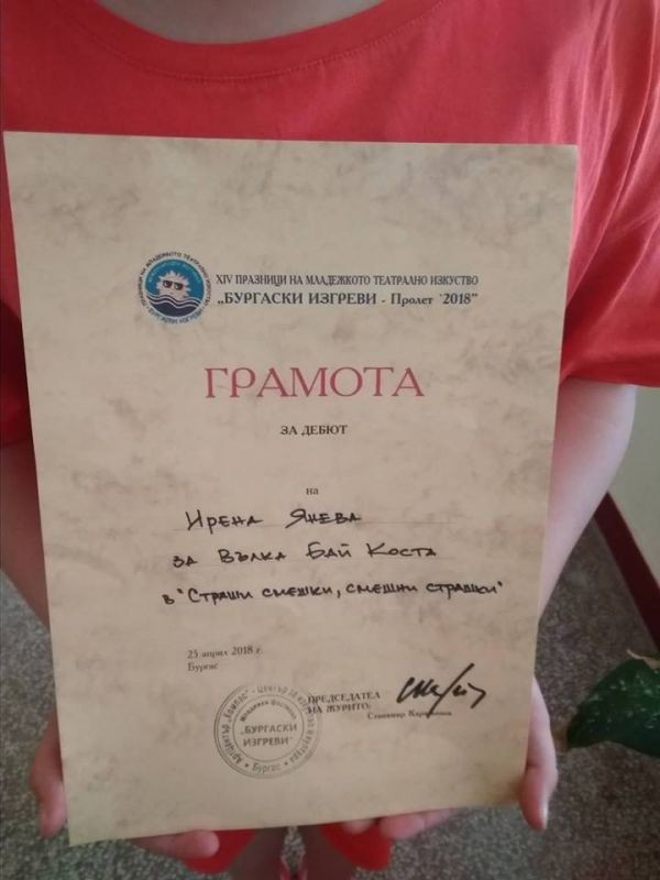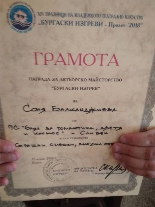 Наши ученици от театралния състав при сдружение "Блян за романтика, цветя и космос" бяха отличени в Международния младежки фестивал "Бургаски изгреви", който се състоя в град Бургас. Със специална награда от журито за актьорски постижения в пиесата "Страшни смешки, смешни страшки" бяха наградени Соня Балканджиева от 1. клас и Ирена Янева от 5. клас.