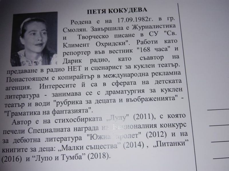 По случай фестивала на детската книга ученици от ЦДО от всички групи на втори клас при ОУ "Елисавета Багряна" посетиха представянето на детската книга "Лупо и Тумба" от Петя Кокудева. Авторката лично запозна децата с героите и творчеството си по много атрактивен начин. Учениците с интерес задаваха въпросите си и бяха много развълнувани да чуят с какво ще ги изненада авторката. Накрая те получиха специален автограф от авторката на Лупо и Тумба Петя Кокудева с пожелания за много сбъднати мечти.