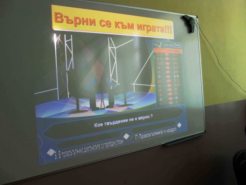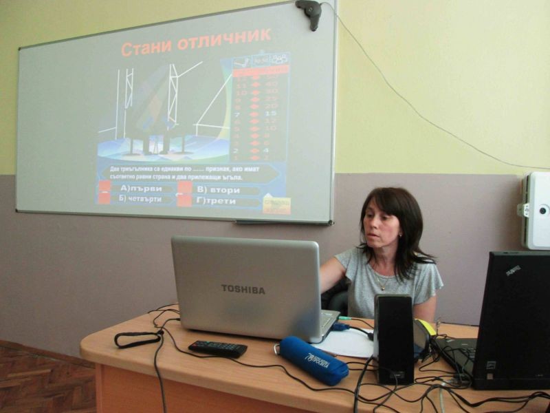 На 15 май, вторник, в новооткритата библиотека на ОУ "Панайот Хитов", се проведе представително занятие на група "От двойка до шестица" по проект "Твоят час" с ръководител Добринка Добрева. С помощта на иновационните технологии, г-жа Добрева беше подготвила на възпитаниците си интересна игра- "Стани отличник", където децата трябваше да се справят с различни задачи о математика от материала за седми клас. Както в еквивалентното предаване "Стани богат", и тук имаше жокери, сигурни суми, но вместо пари, децата трябваше да покоряват различни оценки- от 2 до 6. Накрая, всички групово, постигнаха оптималния резултат- шестицата. Пожелаваме на трудолюбивите седмокласници успехи в предстоящите изпити!