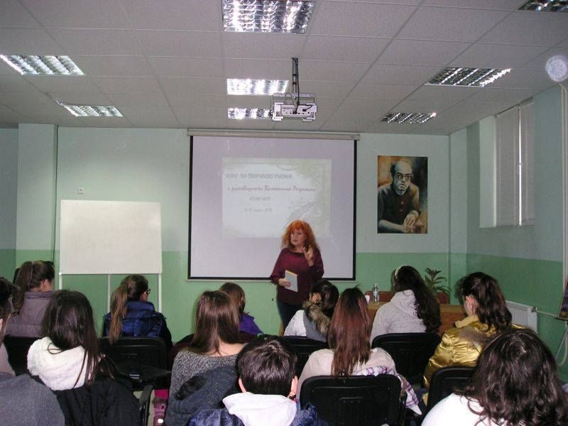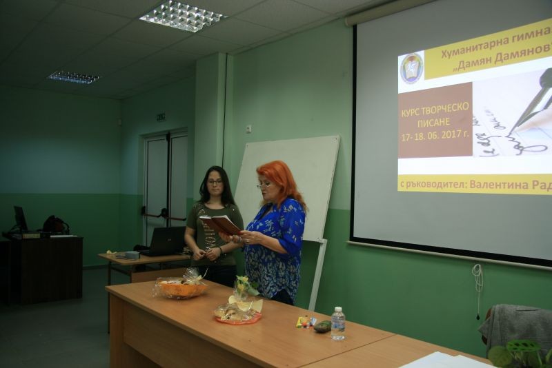 На 9 и 10 юни 2018 г. в Профилирана хуманитарна гимназия „Дамян Дамянов” ще продължи курсът по творческо писане, воден от поетесата Валентина Радинска. Участници в него могат да бъдат ученици от V до XII клас от училищата в област Сливен. Курсът ще включва 4 занятия по 2 часа.