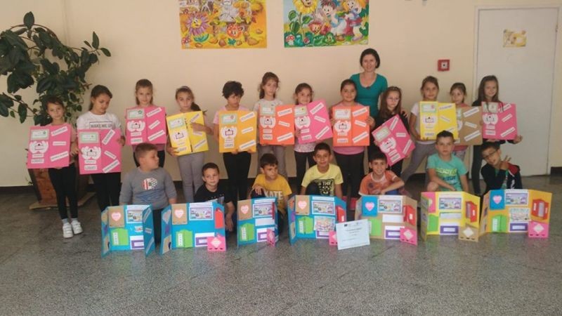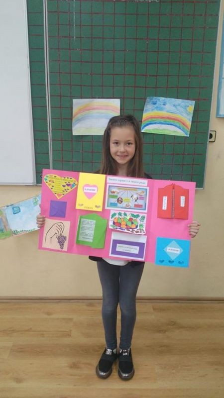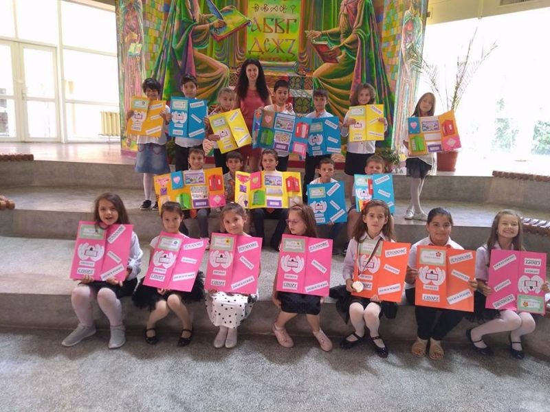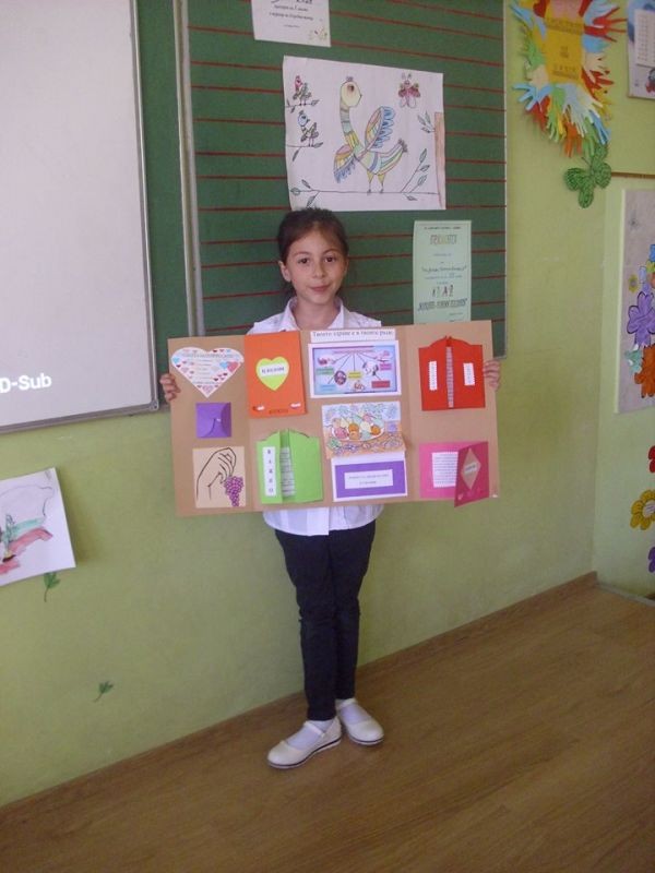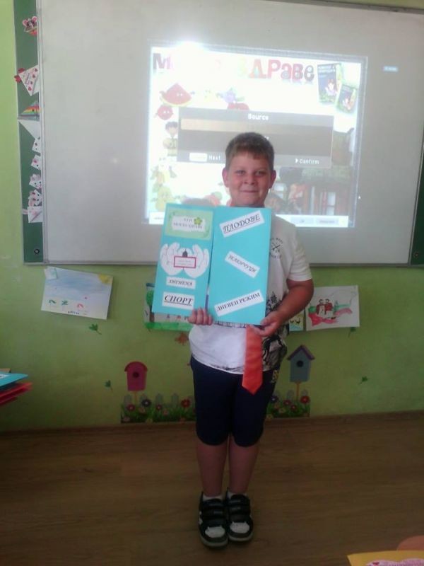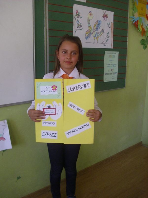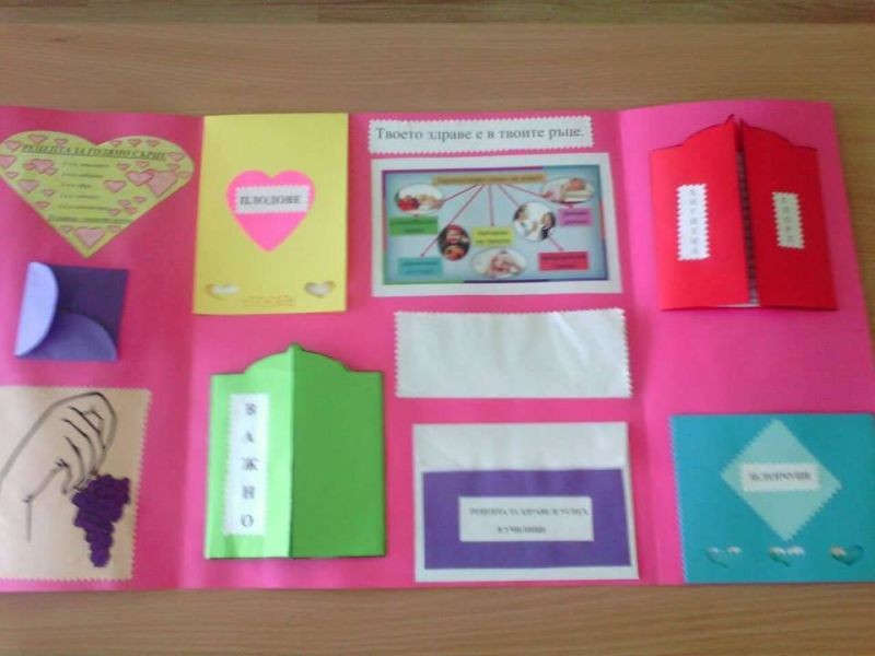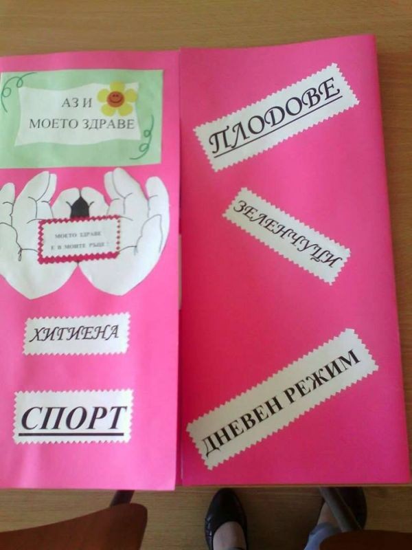 В предходни часове децата от 2 „в” клас подредиха интересна изложба от изработените от тях по време на проекта лапбуци. Красивите папки съдържат информация за важни правила в храненето, дневния режим, хигиената, ползите от спортуването и много други. Презентация, поднесена от ученици за ученици още повече обогати техните знания. Децата с голямо желание показаха какво са научили за здравословния начин на живот и представиха всяка част от своя лапбук. Учениците разбраха, че здравето е най-голямото богатство и то е в нашите ръце!