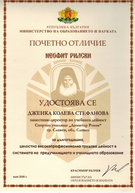 На 23.05.2018г. в зала "Сливен" се раздадоха наградите "Неофит Рилски". Тази година почетното отличие за дългогодишна цялостна високопрофесионална трудова дейност в системата на предучилищното и училищно образование заслужено получи г-жа Дженка Стефанова - заместник директор по учебна дейност в Спортно училище "Димитър Рохов", гр. Сливен.