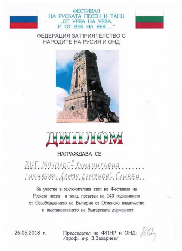 В събота в сградата на драматичния театър „Стефан Киров” се проведе Десетият национален фестивал на руската песен и танц. Тази година той премина под надслов „От урва на урва и от век на век” и бе посветен на 140 годишнината на Освобождението на България от Османско владичество и възстановяването на българската държавност. Вокално-инструменталната група „Монолог” при Профилираната хуманитарна гимназия „Дамян Дамянов” участва във фестивала с две изпълнения – “Круги на воде“ и „Позови меня тихо по имени“. За участието си във фестивала групата и нейната ръководителка Виолина Петкова получиха паметен медал и грамота. Членовете на групата с удовлетворение приеха решението на журито да присъди първа награда на председателя на областния съвет на Съюза на ветераните от войните Николай Тодоров, който от няколко години участва в конкурса с инструментален съпровод на живо от група „Монолог”.