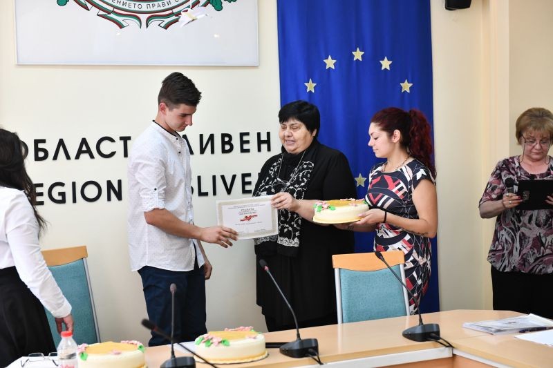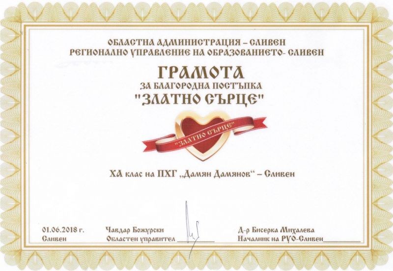 На 1 юни – Ден на детето, с грамота за благородна постъпка „Златно сърце” на Областната администрация и на Регионалното управление на образованието в Сливен бяха удостоени десетокласниците от Профилираната хуманитарна гимназия „Дамян Дамянов” с класен ръководител Валери Милков. Мил жест към наградените ученици е и красивата торта. В периода от 22 октомври до 22 декември 2017 г. те организираха кампания за набиране на средства и дариха немалка сума по сметката на Стилиян Николаев Колев. В училищната общност това не е първи жест на състрадателност към хората в беда. Вече много години ученици, учители и служители подпомагат различни хуманитарни каузи от национално или от местно значение. Традиционно в училището учат най-активните доброволци на младежката организация на БЧК в града. На наградените и на всички техни съученици желаем прекрасните младежки години, които им предстоят, да бъдат и време за още много благородни дела.