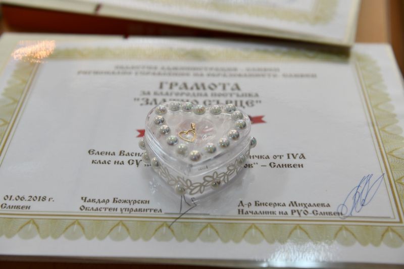 Индивидуални златни сърца и грамота получиха Елена Карадимова - ученичка от IV клас на СУ „Пейо Крачолов Яворов“ – Сливен, която е направила дарение – компютърна конфигурация за подобряване на технологичната среда в детска градина „Иглика“ – с. Стара река, Община Сливен.