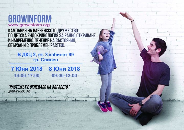 Безплатни прегледи за измерване и оценка на растежа на децата ще се проведат в Сливен и Ямбол на 7, 8 и 9 юни 2018г. Инициативата, която придоби популярност като „Клиника на колела“, е част от стартиралата през септември 2017 г. в УМБАЛ „Св. Марина“ – Варна мащабна кампания на Варненското дружество по детска ендокринология GROWINFORM за ранно откриване и навременно лечение на състояния, свързани с проблемен растеж.
