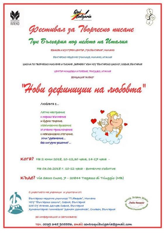 Дейвид Дечев и Дочка Петрова участваха и в провеждания за втора година тук Фестивал за творческо мислене и писане. Тази година той премина под мотото „Нови дефиниции за любовта”. Заедно с нашите участници твориха и представителите на "Българско школо" - София, на 105 –то средно училище "Атанас Далчев" - София и от Българското неделно училище "Пею Яворов" в Милано. В края на фестивалния ден участниците представиха своята "готова продукция" - поетични творби с образи и размисли по общочовешки въпроси.