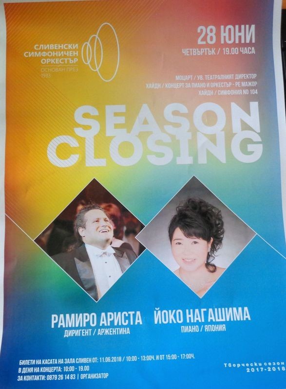 Под съпровода на пианистката Йоко Нагашима ще бъдат изпълнени увертюрата „Театралният директор“ на Моцарт, „Концерт за пиано и оркестър в ре мажор“ и „Симфония № 104“ от Йозеф Хайдн. Диригент на концерта ще бъде аржентинецът Рамиро Ариста.