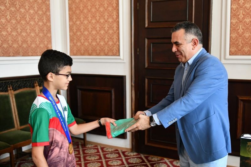 Кметът Стефан Радев посрещна днес в Общината Денис Сираков - завоювалия златен медал от „Турнирът на шампионите" - Международна младежка олимпиада в Тайланд.