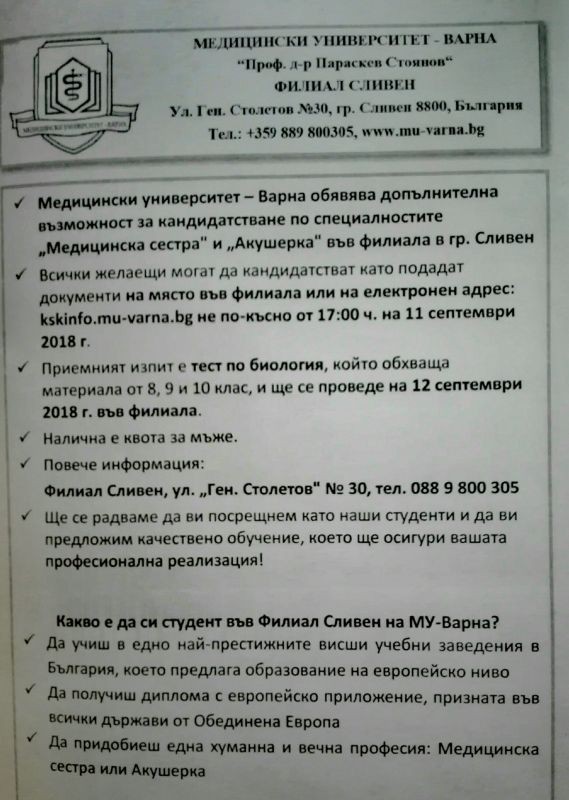 Медицински университет – Варна обявява допълнителна възможност за кандидатстване във филиала в град Сливен по специалностите „Медицинска сестра“ и „Акушерка“.