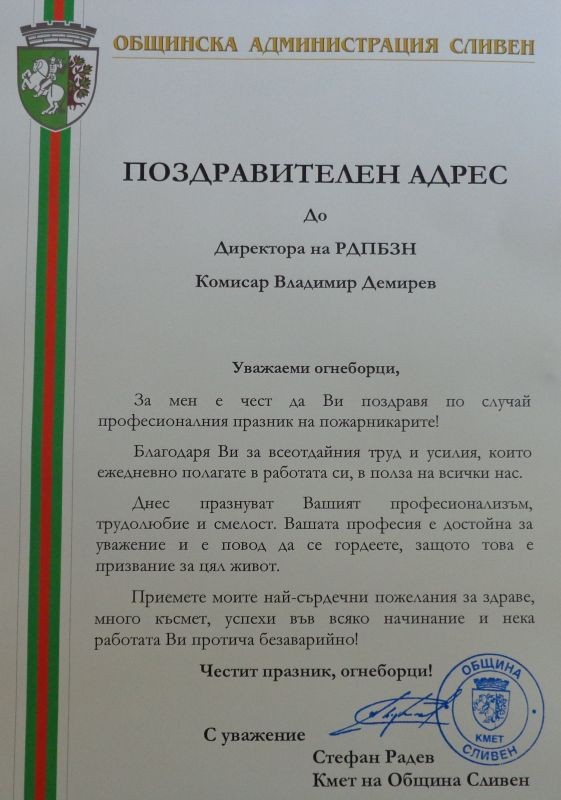 „За мен е чест да Ви поздравя по случай професионалния празник на пожарникарите! Благодаря Ви за всеотдайния труд и усилия, които ежедневно полагате в работата си, в полза на всички нас. Вашата професия е достойна за уважение и е повод да се гордеете, защото това е призвание за цял живот. Днес празнуват Вашият професионализъм, трудолюбие и смелост!“, се казва в поздравителния адрес.