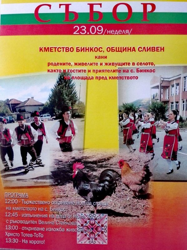 За трета поредна година ще се проведе събор в село Бинкос. Той ще започне в 12 часа с официално откриване на новата сграда на кметството.