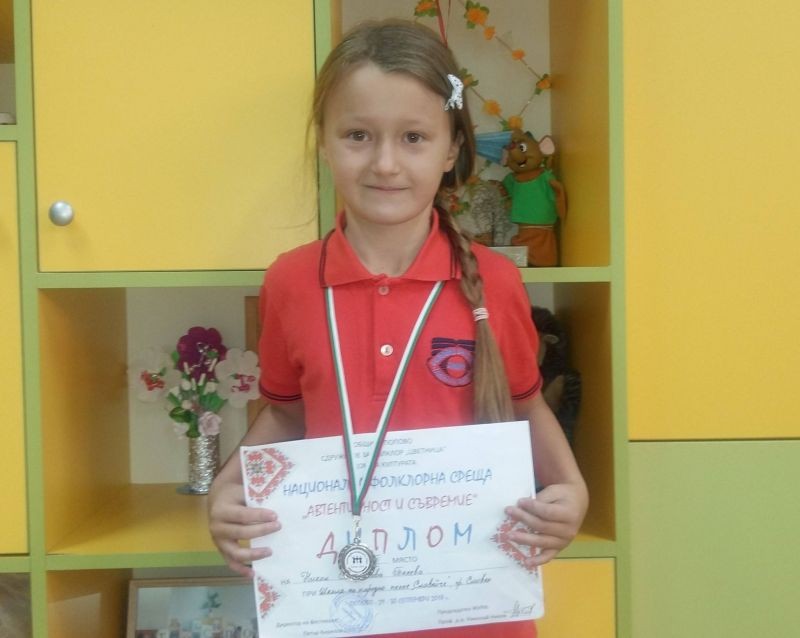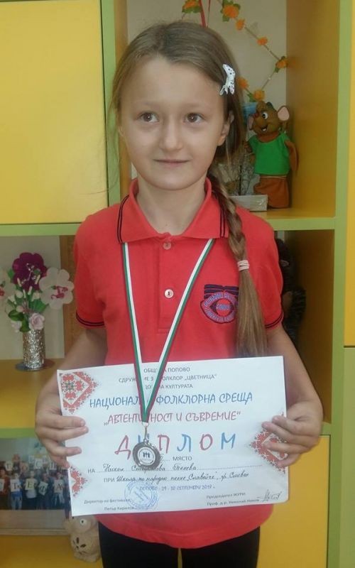 В края на месец септември в гр.Попово се проведе НАЦИОНАЛНА ФОЛКЛОРНА СРЕЩА „АВТЕНТИЧНОСТ И СЪВРЕМИЕ“. Участие във фестивала взе Никол Стефанова Тенева - ученичка от 3“д“ клас. Тя зае второ място в групата за народно пеене и получи грамота и медал. Поздравления за Никол! Пожелаваме й още много успехи през годината!
