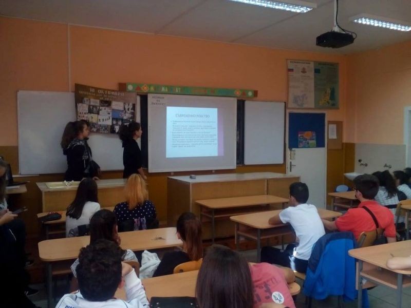 На 18.10.2018 г. под мотото „Заедно против трафика на хора” премина събитието, организирано от Ученическия съвет при ОУ „Елисавета Багряна” гр. Сливен. По повод Международния ден за борба с трафик на хора, ученици от седми клас подготвиха и представиха пред свои учители, съученици и приятели презентация относно проблема с трафика на хора, решаваха казуси и беседваха по темата. Целта на поставената тема е превантивна работа с учениците, които са в изключително уязвима възраст.