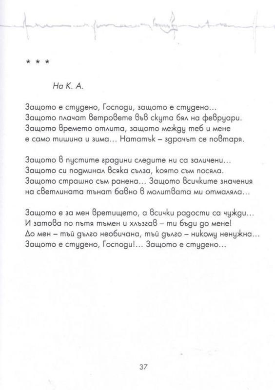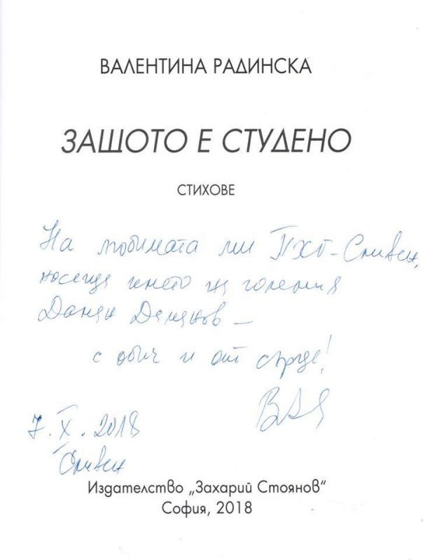 Тя е дар за училището от Валентина Радинска, ръководителка на курса по творческо писане. „Защото е студено“ се появи на бял свят неотдавна и получи заслужено признание от читатели, критици и творци. Калин Донков определя стихосбирката като „събитие в днешната българска поезия“, а Николай Милчев – „като учебник по поезия и учебник по любов“. Книгата е представена от издателство „Захарий Стоянов“, а блестящото ѝ оформление е дело на художника от Поморие Милко Талев.
